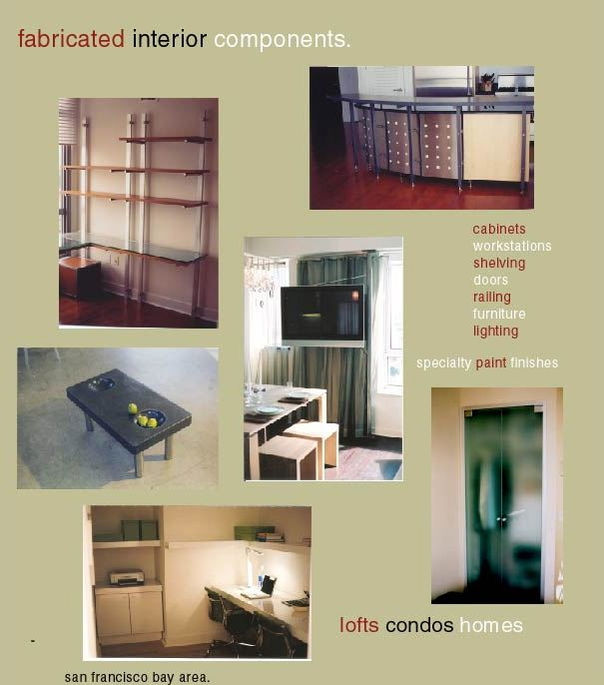 Design solutions, furniture fabrication, assembly. cabinetry, metalworking, architectural glasswork, decorative concrete, A/V home theater, stage props, lighting, signage, displays, railing, industrial components, specialty paints and finishes, living botanical walls/landscape,